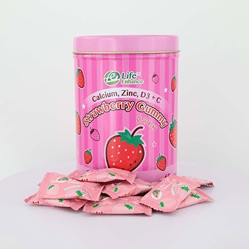草莓软糖含钙、锌、维他命D3及C,专为儿童提供强健骨胳,牙齿,智力发展及 增强抵抗力的重要元素,为儿童打好基础,健康成长。每日只需1-2粒,便能提供儿童健康成长所需。本产品绝不含麸质、人造色素、甜味剂及防腐剂,减少引致过敏。配合天然草莓味,清香可口,烟韧不黐牙,大人儿童都喜爱。
